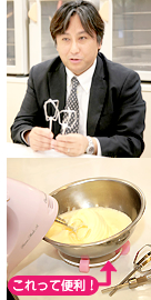 商品の開発に携わっている株式会社クイジナートの庄司さん、生徒の深谷さんと小森さん、そして今回はホームメイドクッキング・開発課ケーキコース担当の宍戸先生にお話しを伺いました。